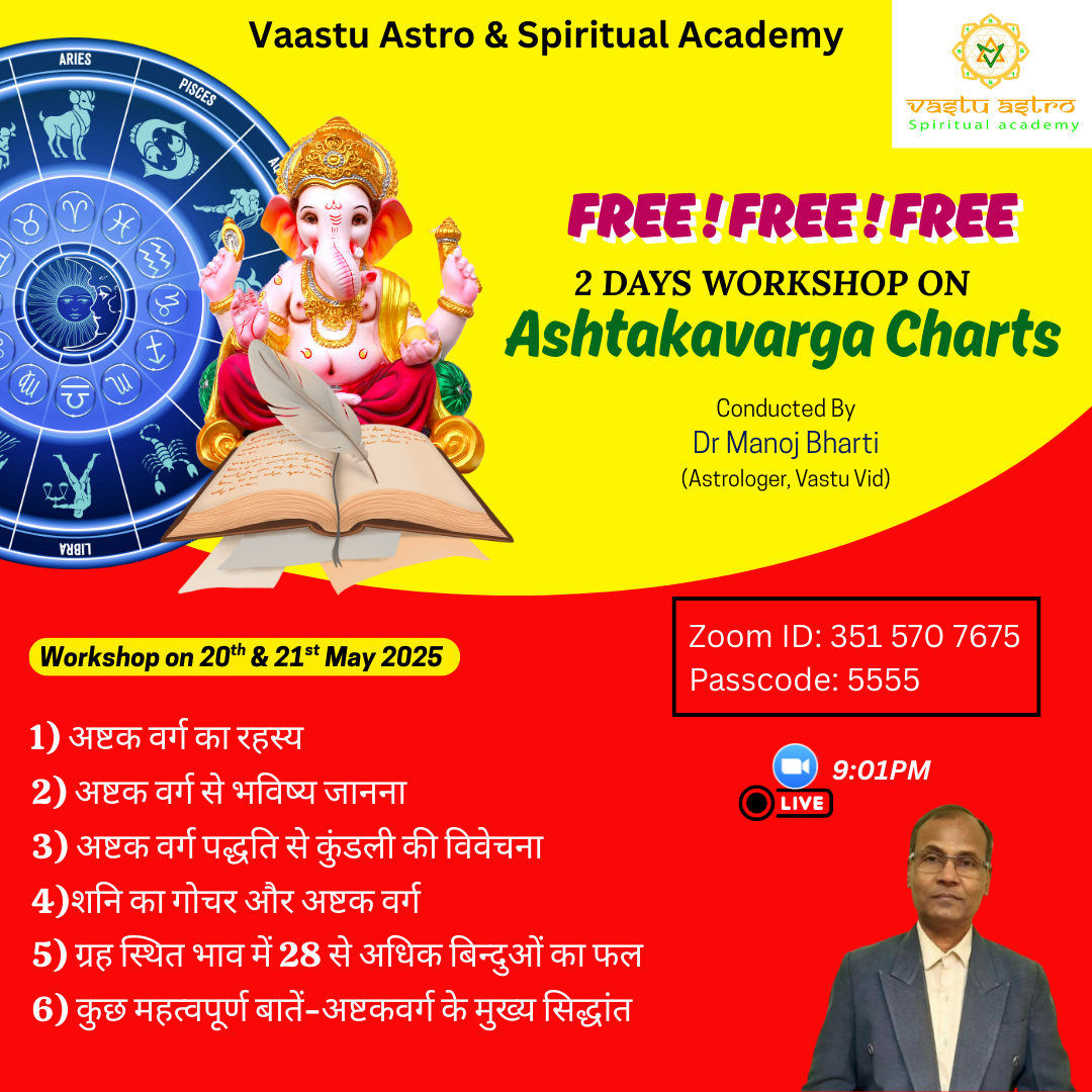 🌸 Following Topics will be covered in 2 Days Workshop 🌸 1) अष्टक वर्ग का रहस्य 2) अष्टक वर्ग से भविष्य जानना 3) अष्टक वर्ग पद्धति से कुंडली की विवेचना 4)शनि का गोचर और अष्टक वर्ग 5) ग्रह स्थित भाव में 28 से अधिक बिन्दुओं का फल 6) कुछ महत्वपूर्ण बातें-अष्टकवर्ग के मुख्य सिद्धांत